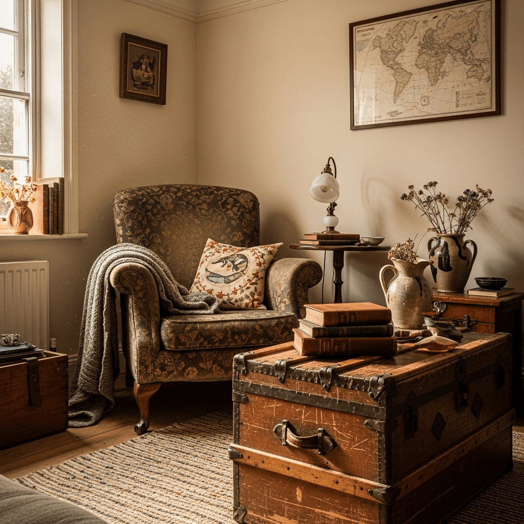 Mix vintage finds, inherited pieces, and flea market treasures creating the collected-over-time warmth that new furniture alone cannot achieve.