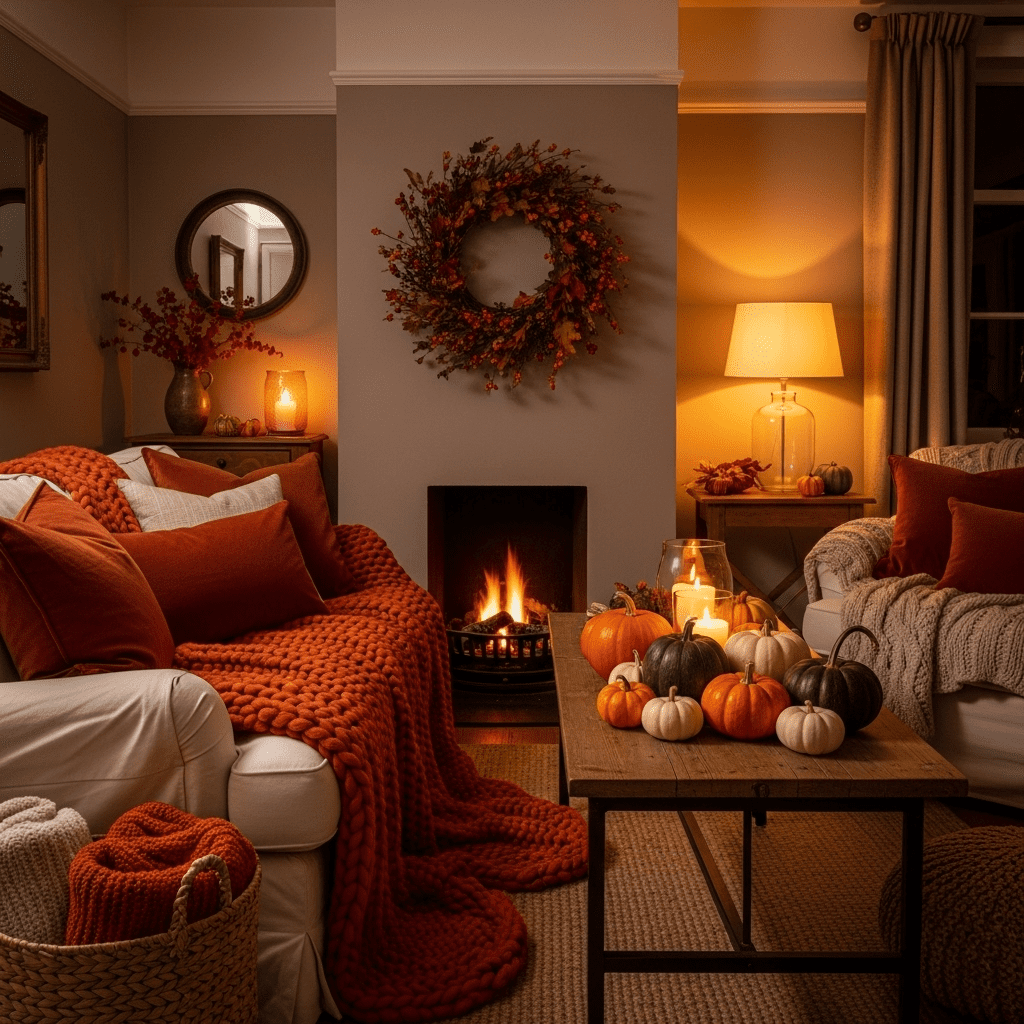 Autumn Transition: Warmer colors, harvest decorations, medium-weight textiles as temperatures drop creating fall coziness.