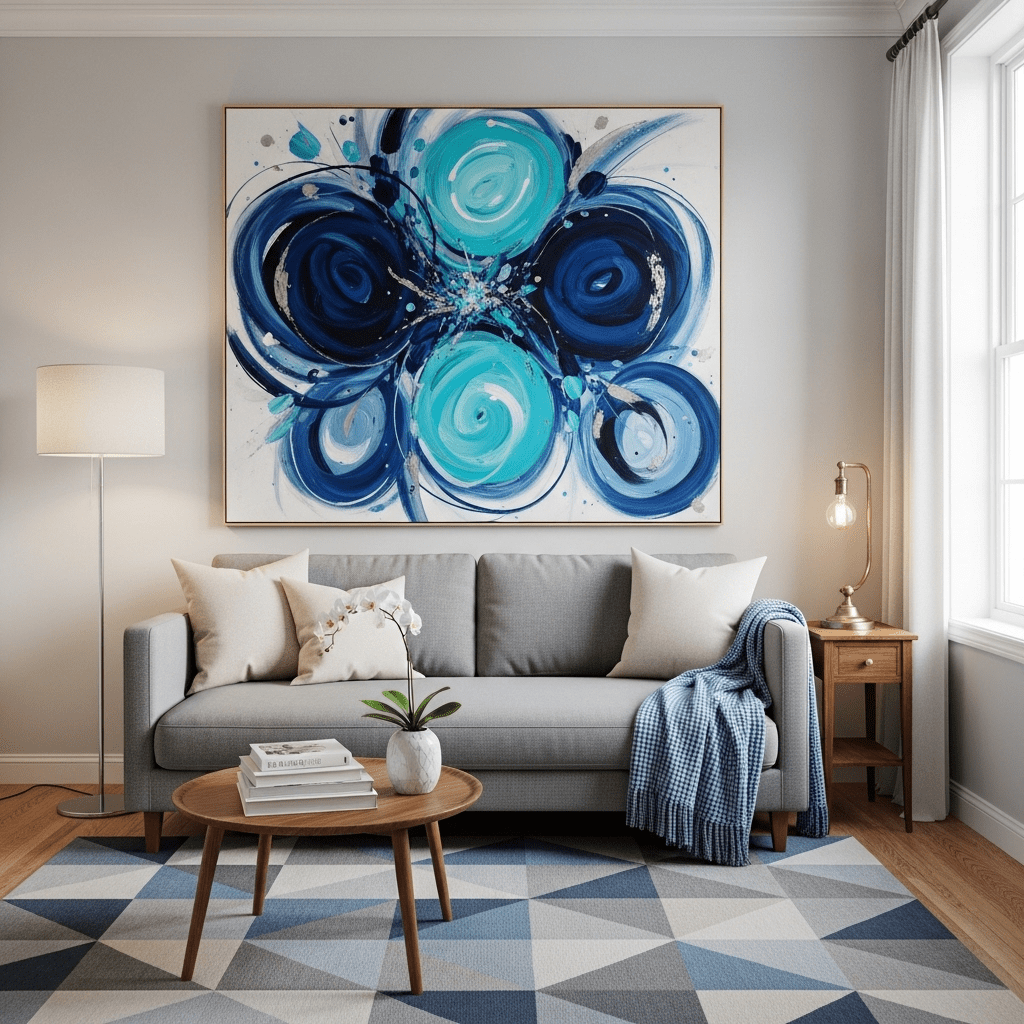 Instead of a “busy” gallery wall of small frames, hang one massive piece of art. A single large focal point provides a sense of grand scale and prevents the walls from feeling cluttered.