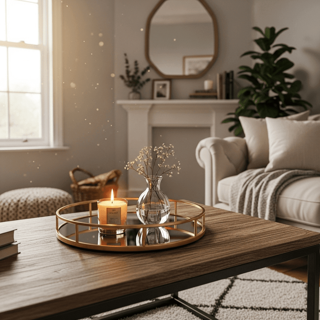 Use a mirrored or metallic tray on your coffee table to organize remote controls and candles. The reflective surface bounces light and adds a touch of “jewelry-like” sparkle to the center of the room.