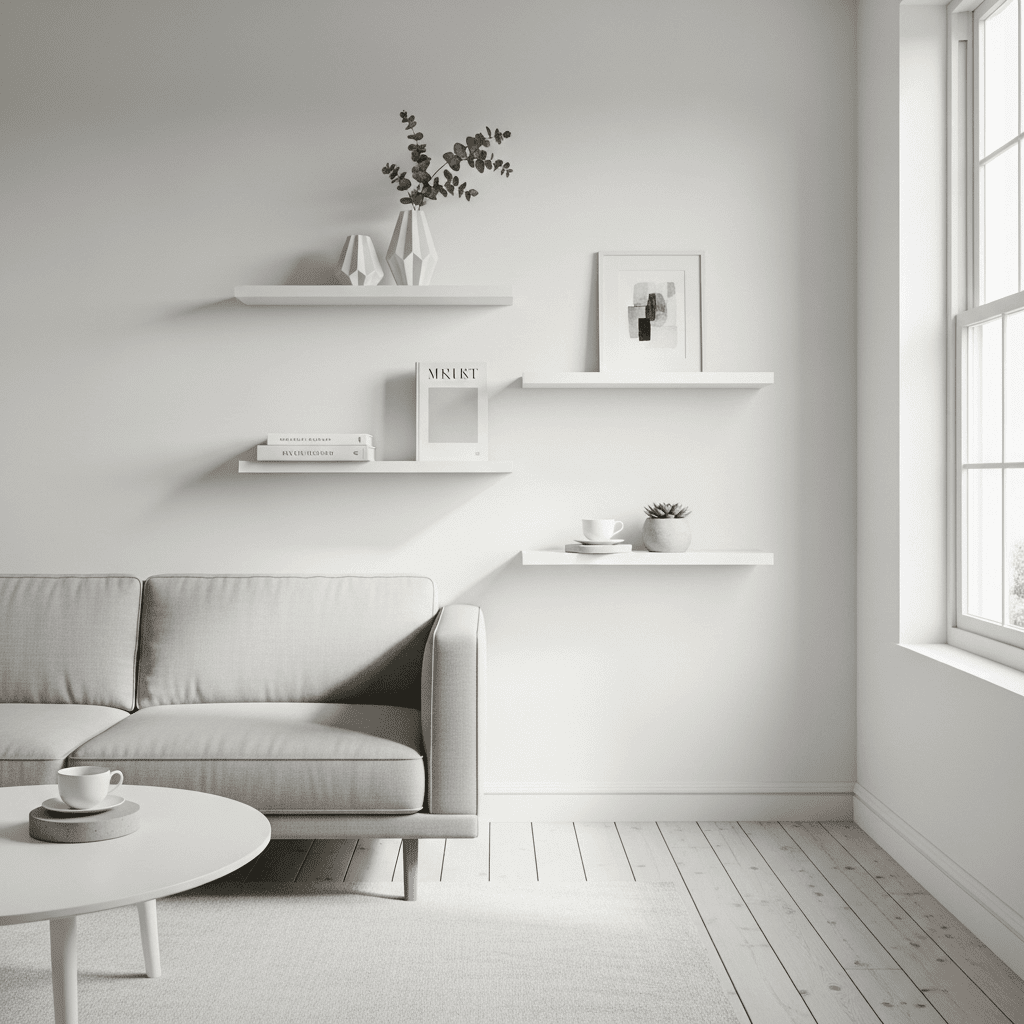 Replace heavy bookcases with slim floating shelves in the same color as the wall. This provides a place for decor to “hover,” keeping the floor area clear and maintaining an open feel.