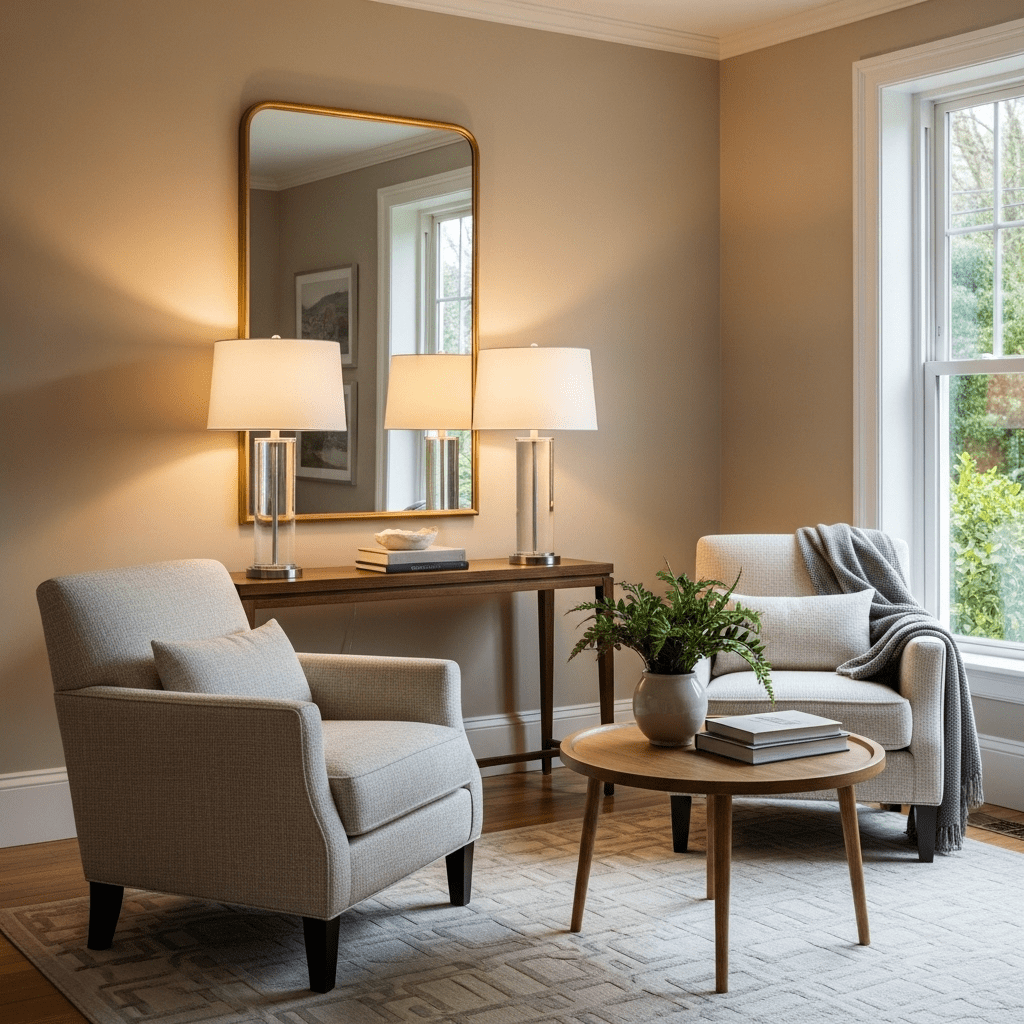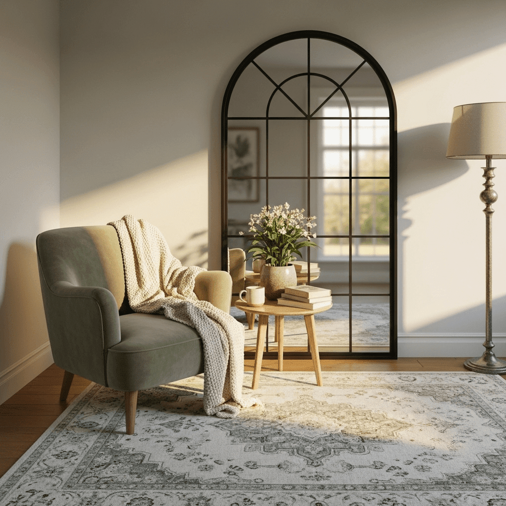 Hang a large, arched mirror. The architectural shape tricks the brain into perceiving it as a window, adding simulated depth and reflecting the room’s light.