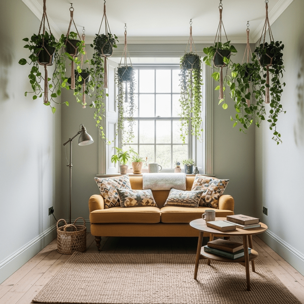 Use hanging planters or wall-mounted “living walls” for your indoor plants. Utilizing the vertical plane for greenery adds life and color without occupying precious side table or floor space.