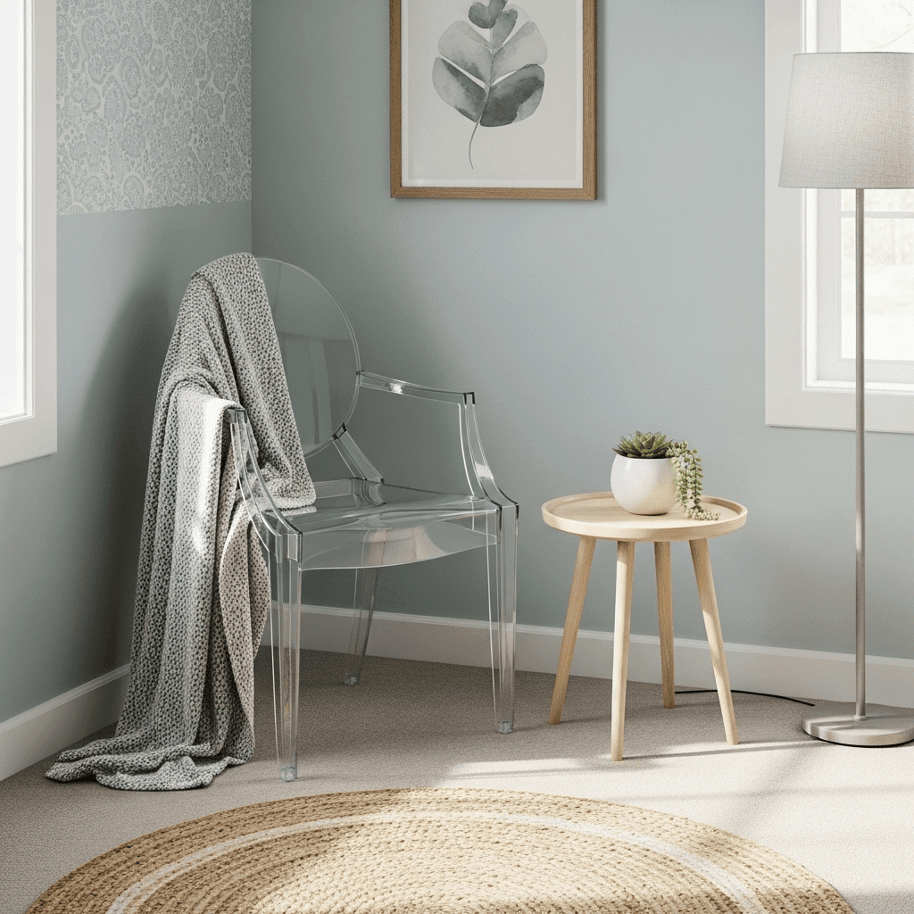 Incorporate a clear acrylic side chair or “ghost” stool. Because it is transparent, it provides extra seating for guests without contributing to visual clutter.