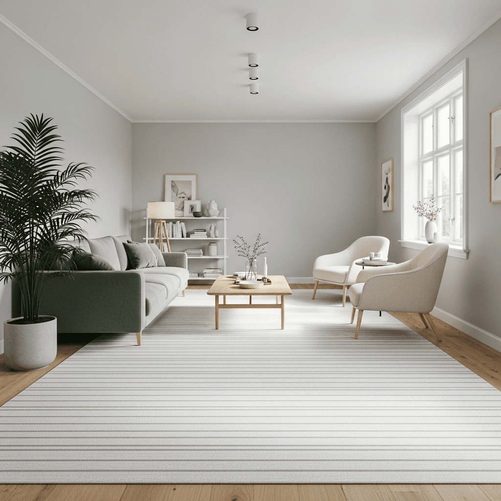 Use a rug with thin, horizontal stripes. Much like pinstripes on clothing, stripes on a floor can “push” the walls outward, making a narrow room feel wider.