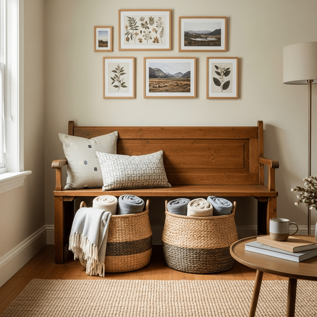 Incorporate stylish woven baskets under coffee tables or in corners. These add a natural, organic texture to the decor while serving as a “catch-all” for toys or extra pillows.