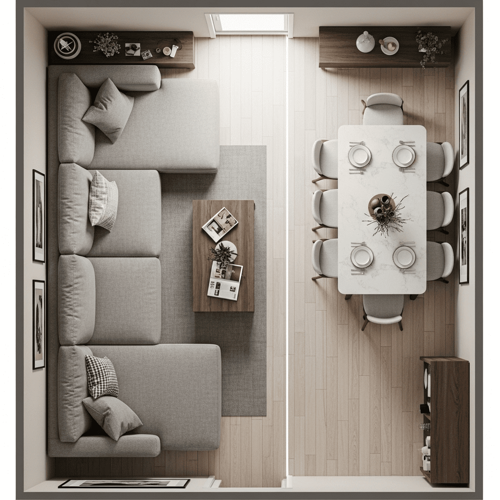 Successfully combining living and dining functions in small spaces requires understanding fundamental principles that prevent common failures.