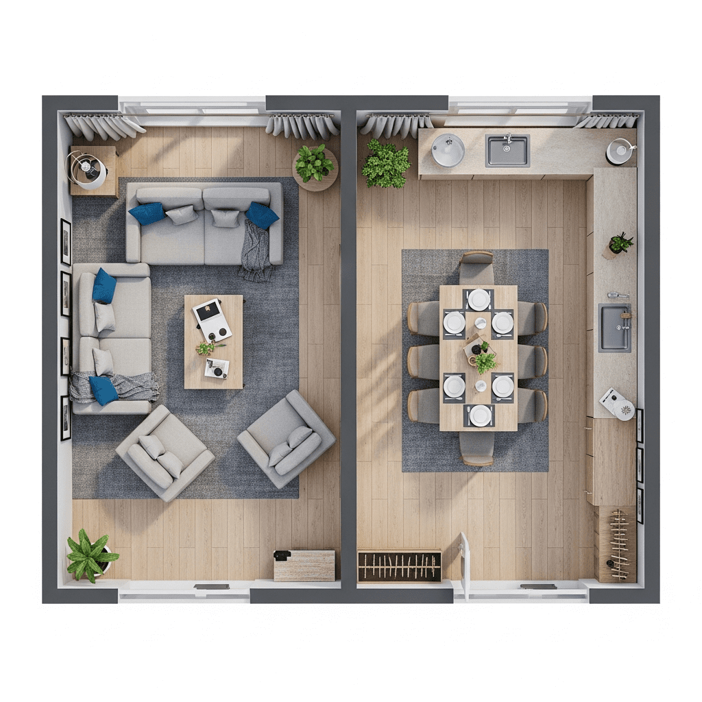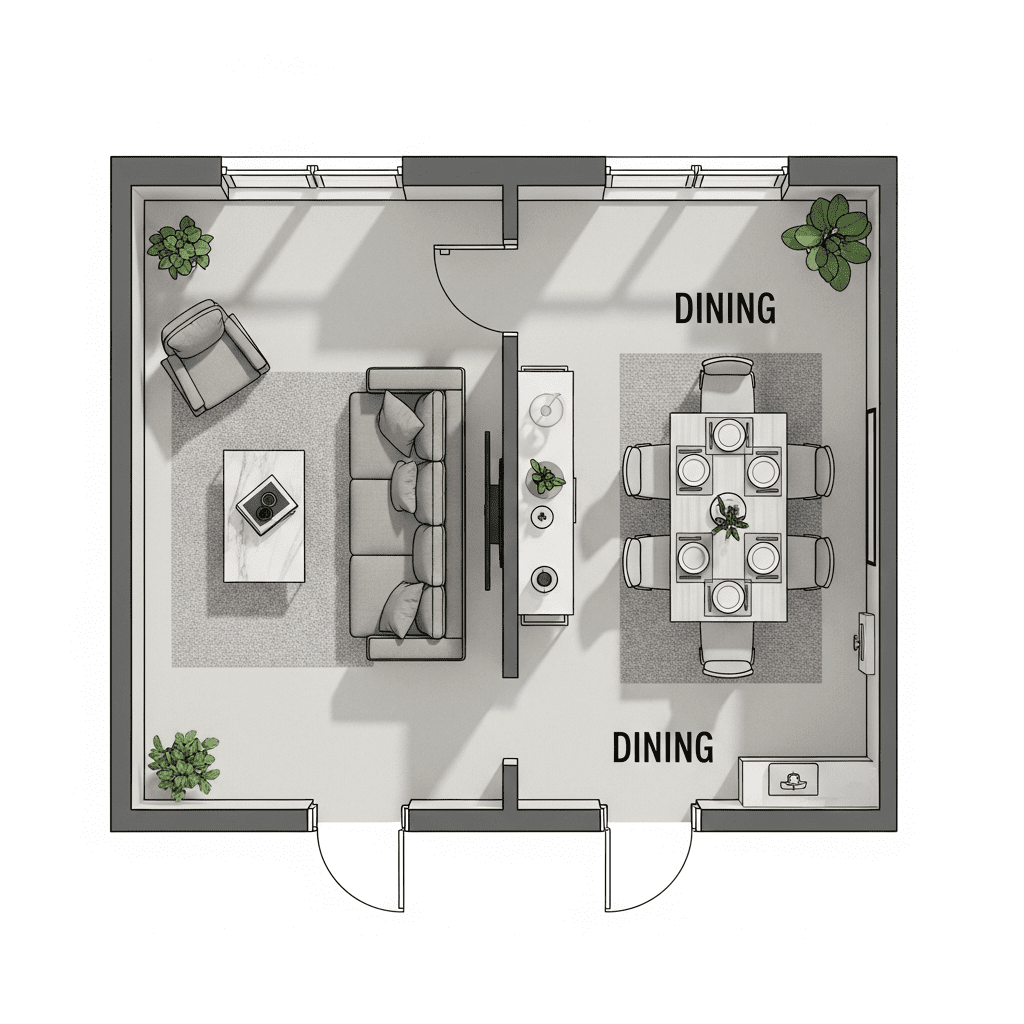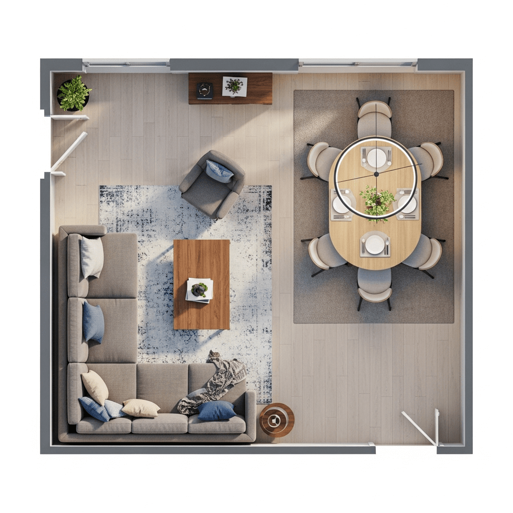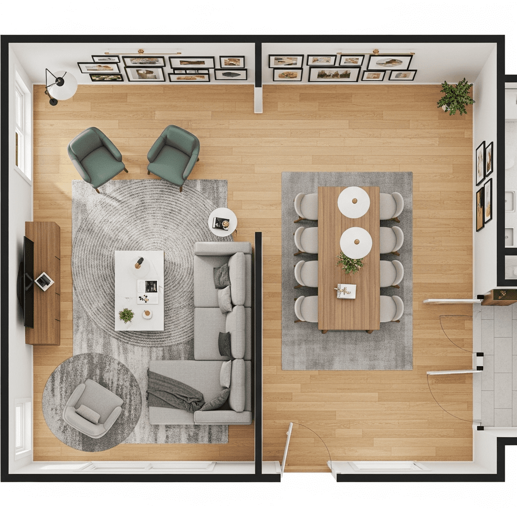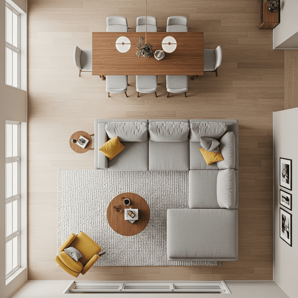 Area Rugs: Different rugs under living versus dining furniture create clear visual zones without physical barriers.