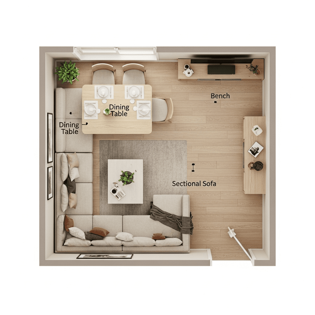 Dining bench against wall serves as extra living room seating when needed, maximizing furniture versatility in compact combo spaces.