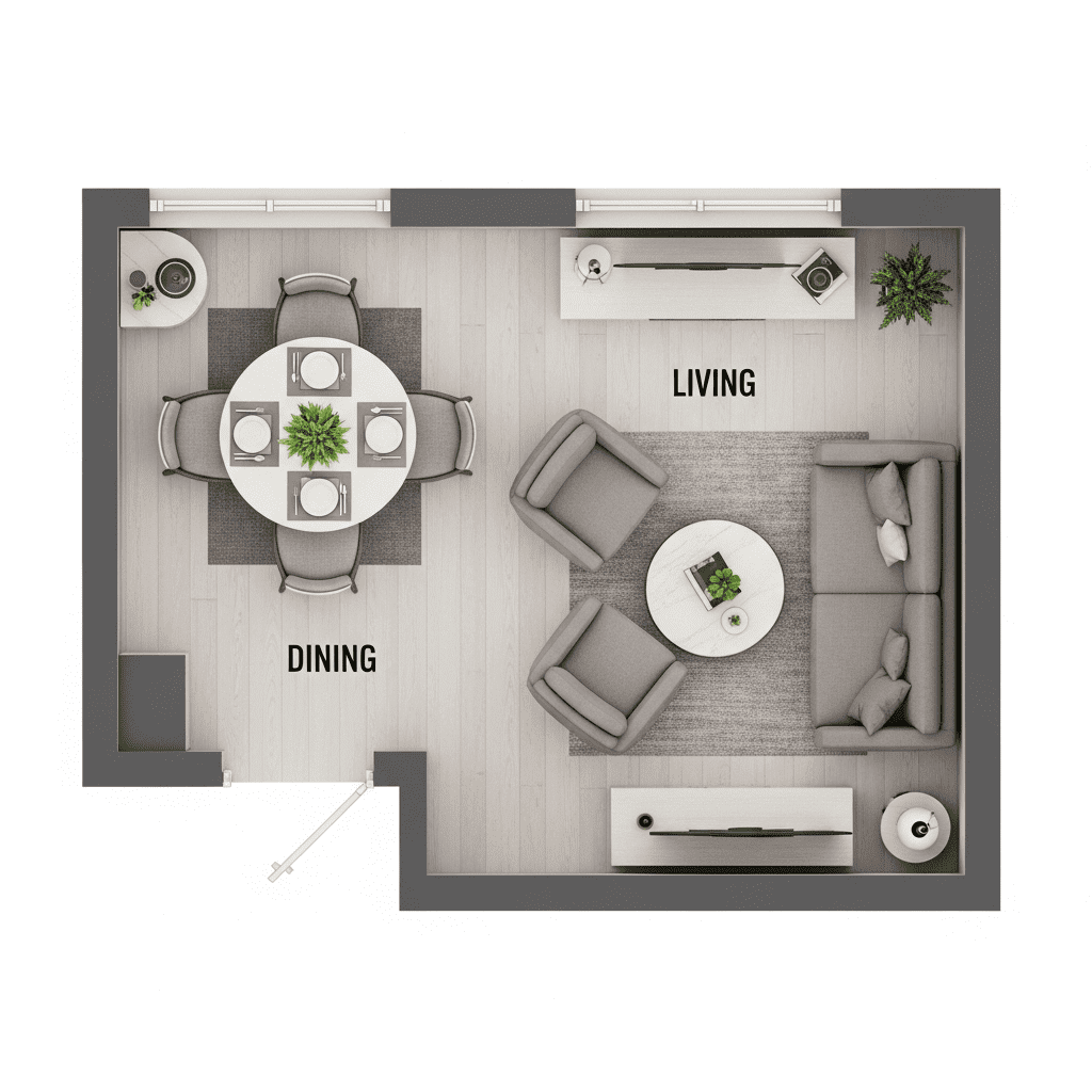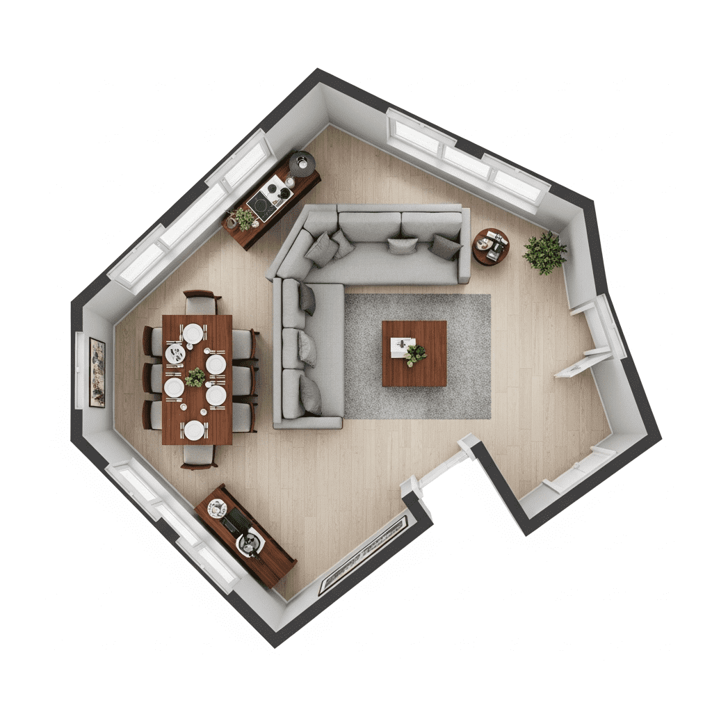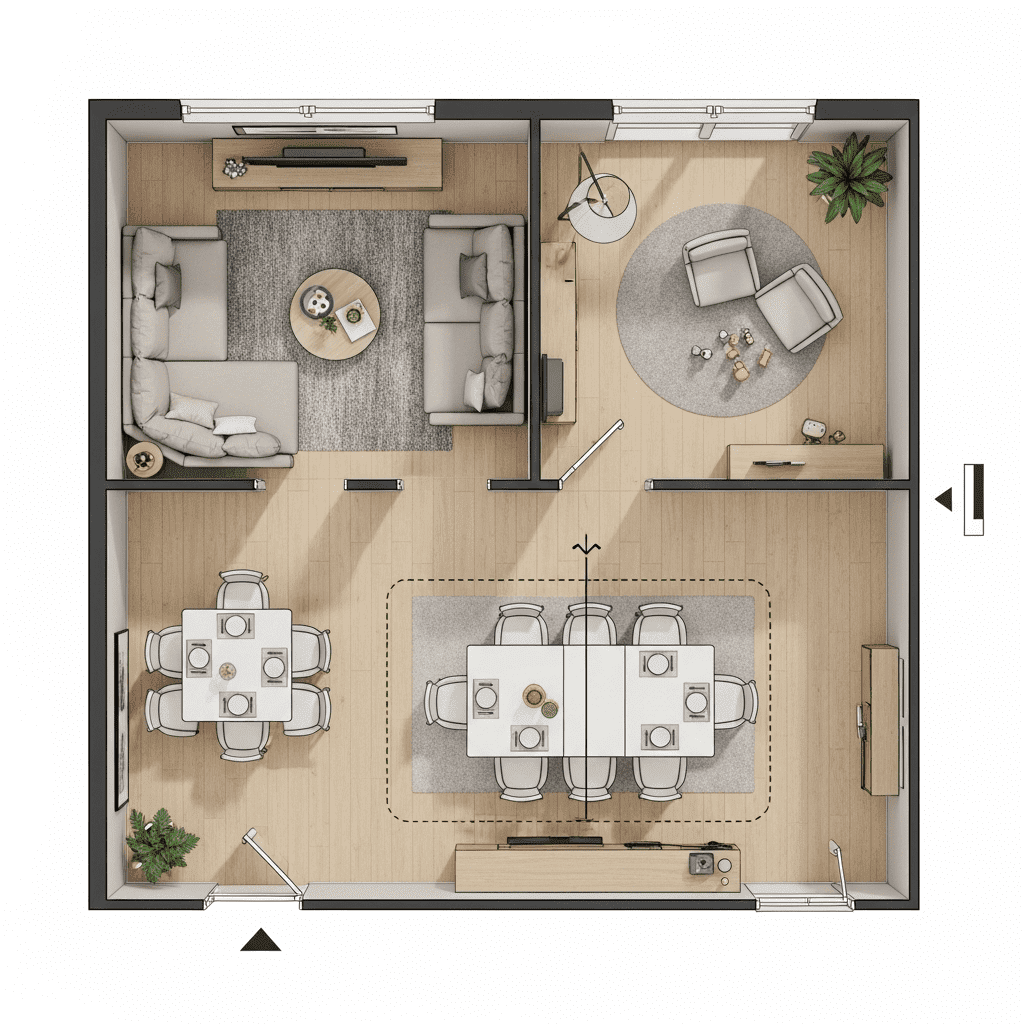 Scaled Furniture: Both living and dining furniture must scale appropriately to room size. Oversized pieces overwhelm; undersized appear temporary and uncomfortable.