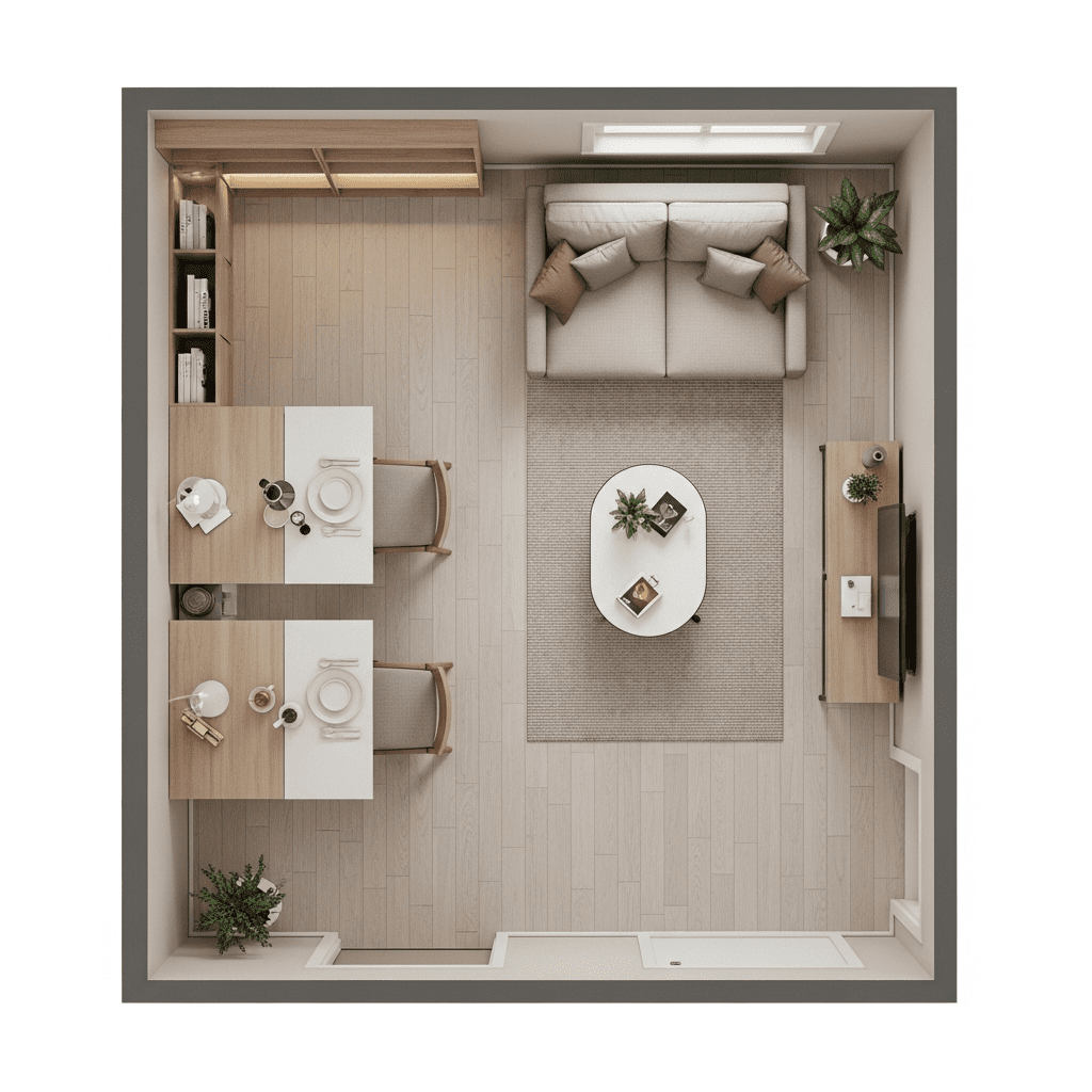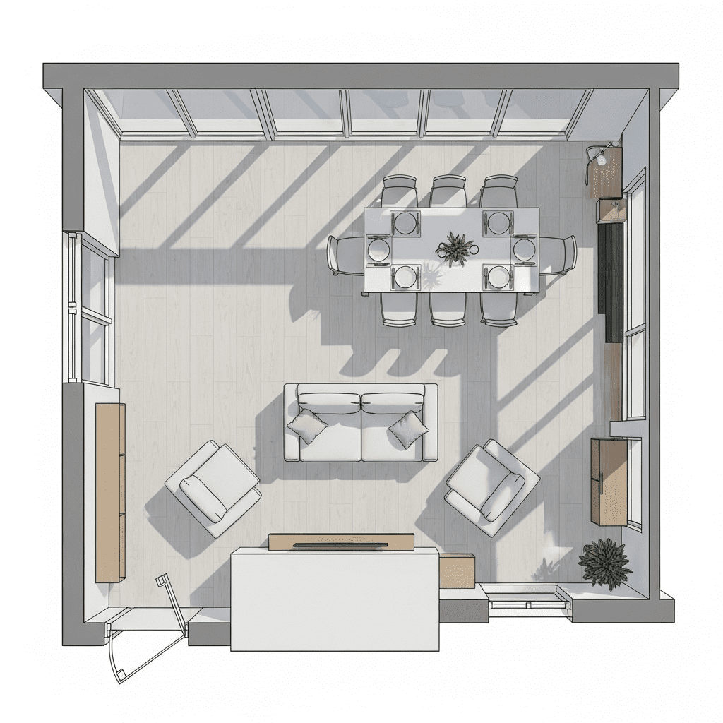 Natural Light: Maximize windows with minimal treatments allowing maximum daylight benefiting both zones simultaneously.