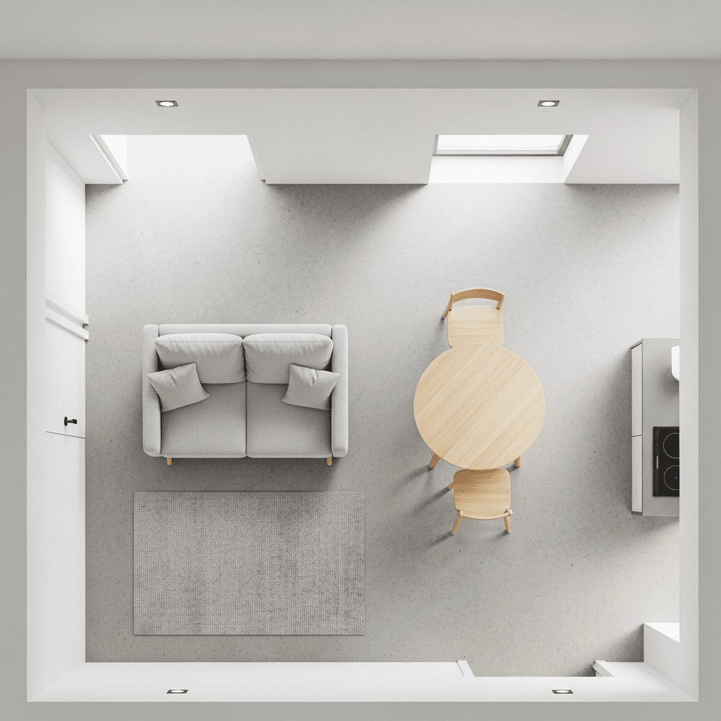 Intentionally sparse furniture—small loveseat, compact dining table—prioritizes open floor space over maximum seating capacity.