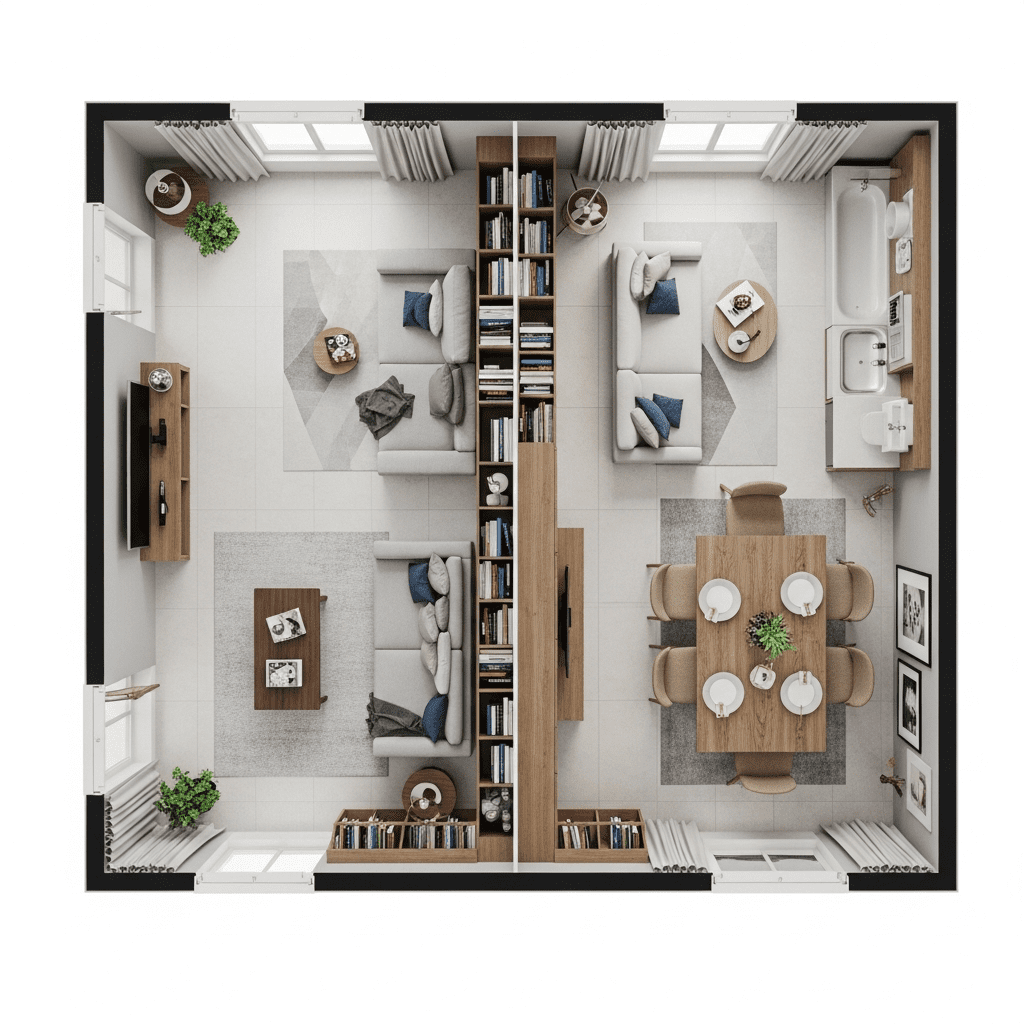 Dual-Zone Storage: Credenzas or cabinets serving both areas—dishes one side, living room items other—maximize efficiency.