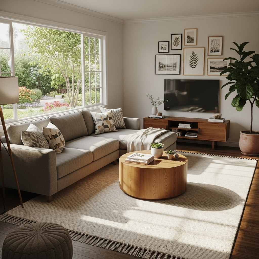 Works beautifully with an L-shaped sofa arrangement, leaving ample walking space and creating a cozy conversation area.