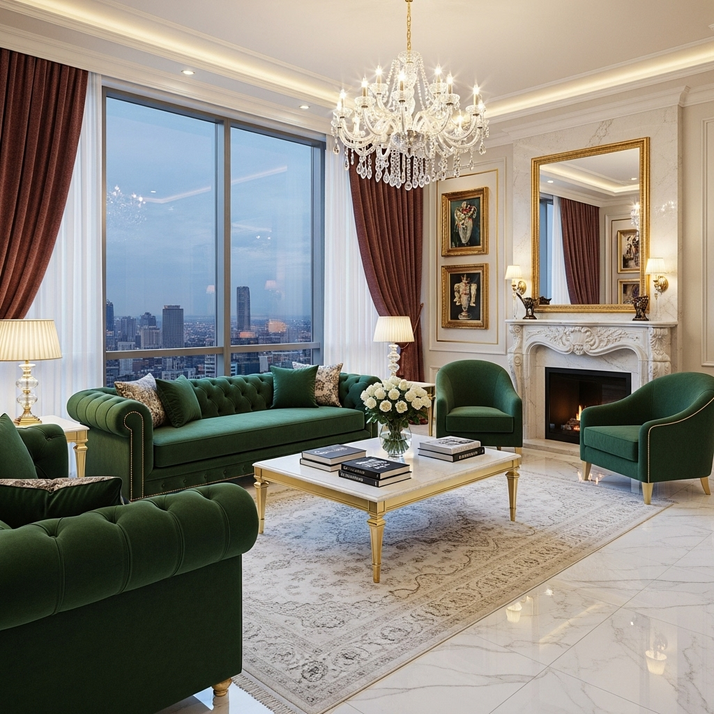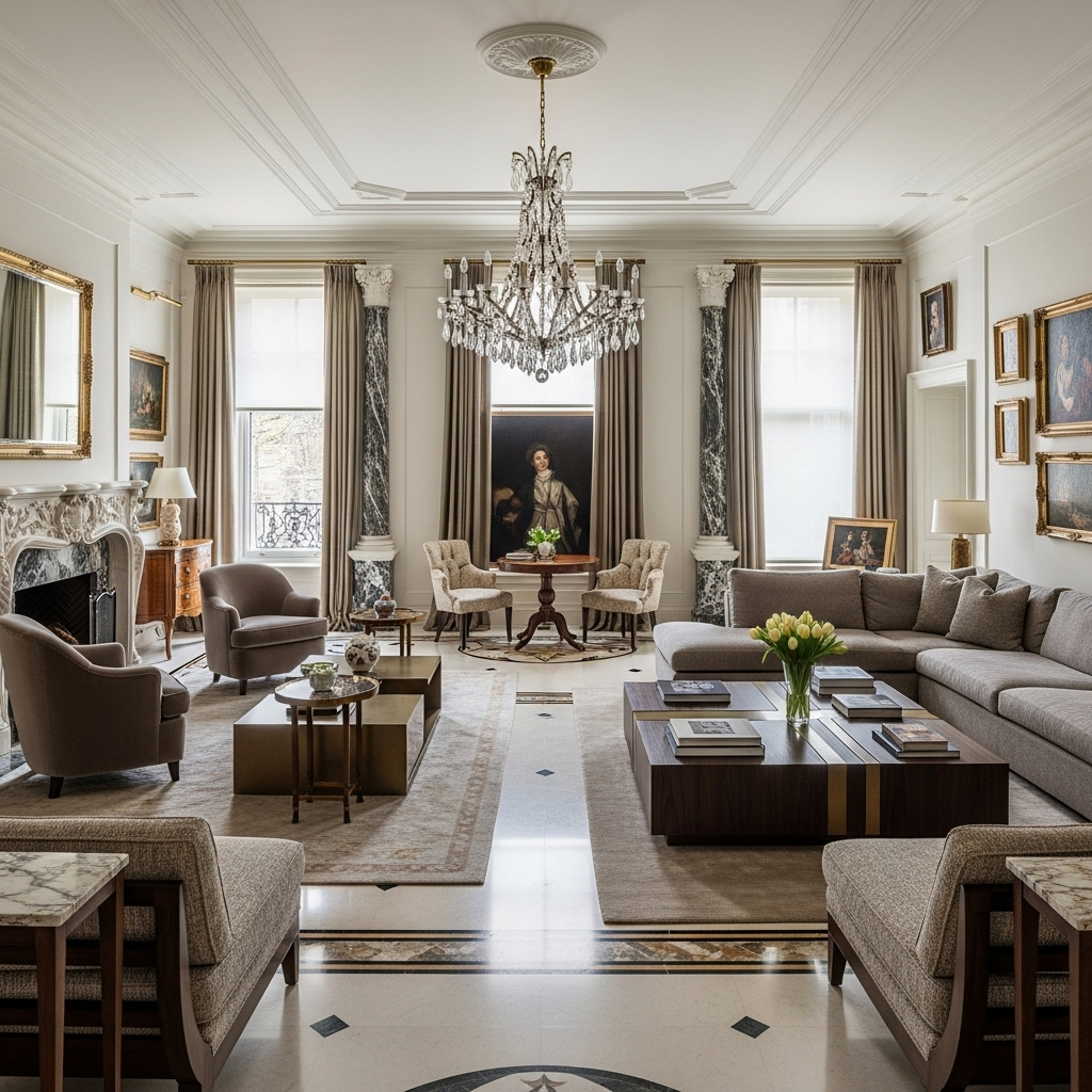 Embraces opulence with premium materials, custom furniture, and sophisticated architectural details.