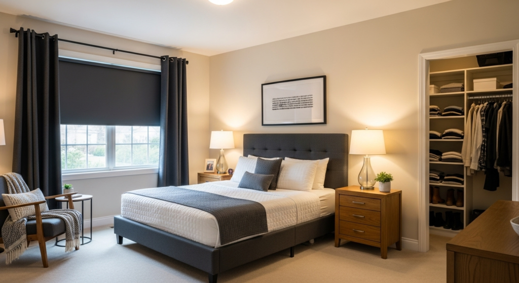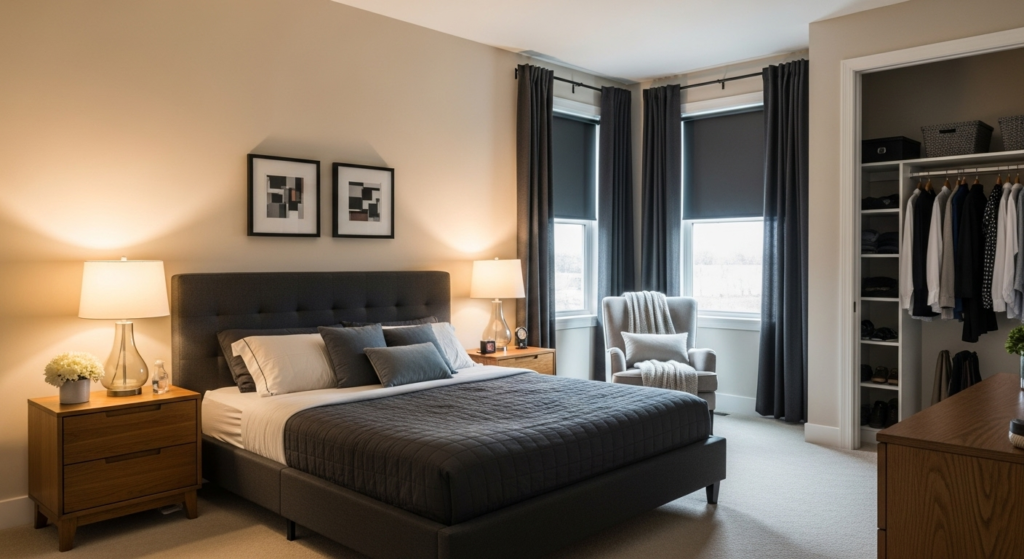 Include practical elements like a charging station for devices, good reading lights, and perhaps a chair for putting on shoes or working. Window treatments should be functional—blinds or simple curtains that block light. Add one or two pieces of meaningful artwork. The space should feel intentional, clean, and comfortable.