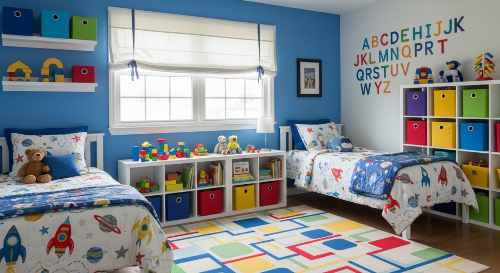 Popular color schemes include blues, greens, greys, and combinations of these. Navy blue with white or grey creates a classic look that ages well. Adventure themes like space, dinosaurs, vehicles, or sports allow for creativity without being too babyish.