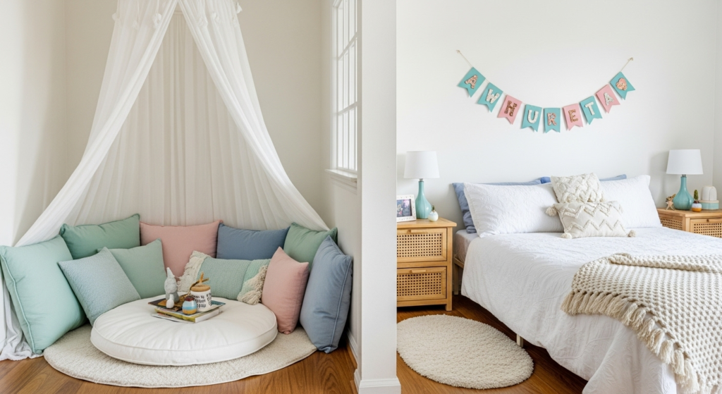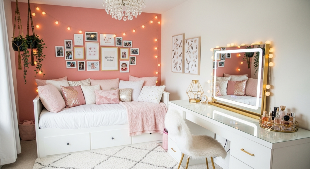 Consider adding a creative space—an art table, a reading nook with floor cushions, or a small vanity for older girls. Good lighting includes overhead lights, a desk lamp, and perhaps string lights for ambiance (battery-operated for safety).