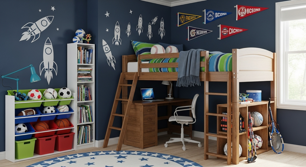 Add personality through bedding, curtains, wall art, and rugs rather than permanent fixtures. This allows easy updates as interests change. Sports equipment storage, like hooks for baseball bats or bins for balls, keeps the room organized. Good task lighting helps with homework and reading.