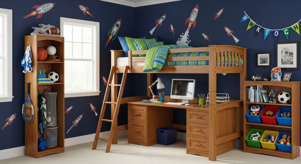 Choose sturdy, durable furniture that can handle active play. A solid wood bed frame lasts longer than particle board. Consider a loft bed or bunk bed to maximize floor space for play areas. Include plenty of storage for toys, books, and collections—boys often accumulate lots of stuff.