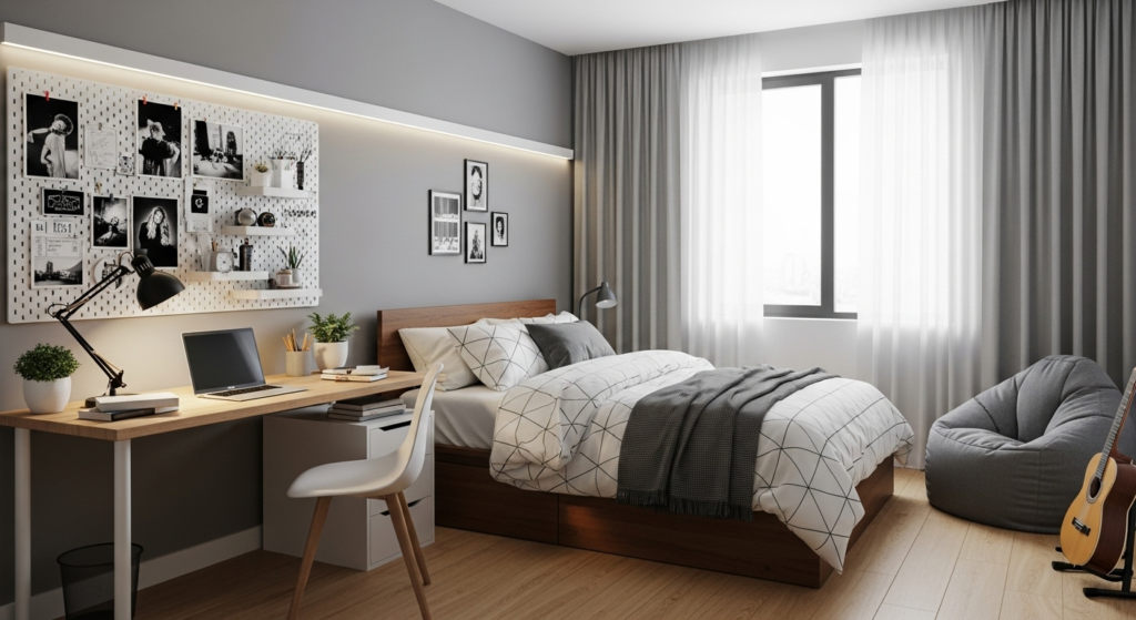A bedroom interior for a young adult reflects independence, maturity, and personal style. Young adults need bedrooms that function as private retreats, often serving multiple purposes like working from home, exercising, or entertaining.