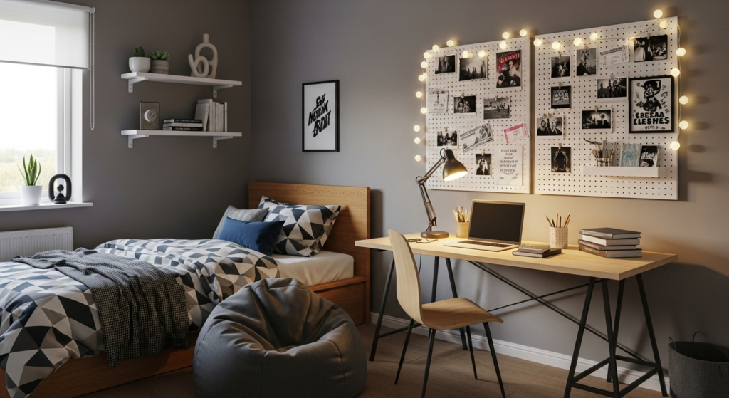 A good desk setup is crucial for homework and computer use. Include ergonomic seating, good lighting, and cable management for electronics. Create a comfortable seating area beyond the bed—floor cushions, a bean bag, or a small sofa gives friends a place to hang out.