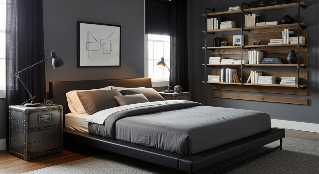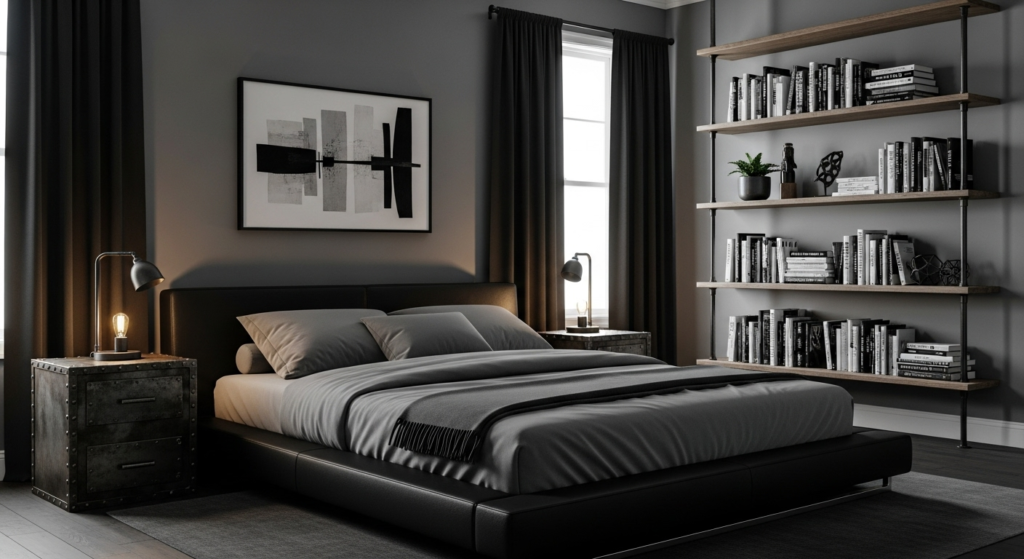 Invest in a quality bed and mattress. Men’s bedrooms often feature platform beds, leather upholstered headboards, or simple wooden frames. Crisp, solid-colored bedding in navy, grey, charcoal, or white looks clean and sophisticated. Skip decorative pillows—functional is fine.