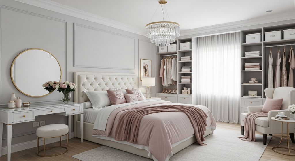 Include a vanity or dressing area with good lighting and mirror. Adequate storage keeps the space serene—organize jewelry, accessories, and clothing. A full-length mirror is essential. Consider a comfortable seating area—a reading chair with ottoman or window seat.