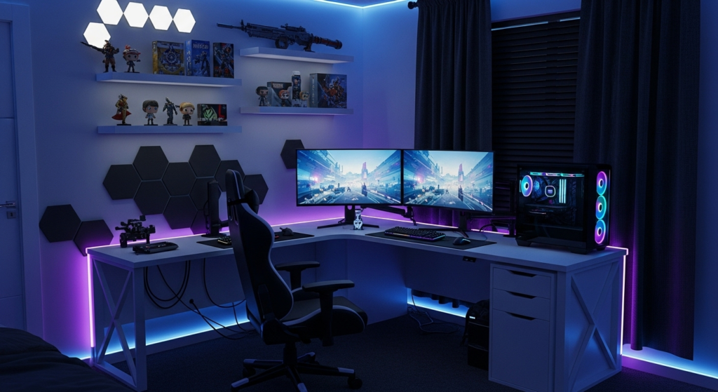 Start with a dedicated gaming setup area. An L-shaped or corner desk provides space for multiple monitors, consoles, keyboard, and accessories. Cable management is crucial—use clips, sleeves, or channels to keep cords organized and safe. Ergonomic gaming chairs prevent back pain during long sessions.