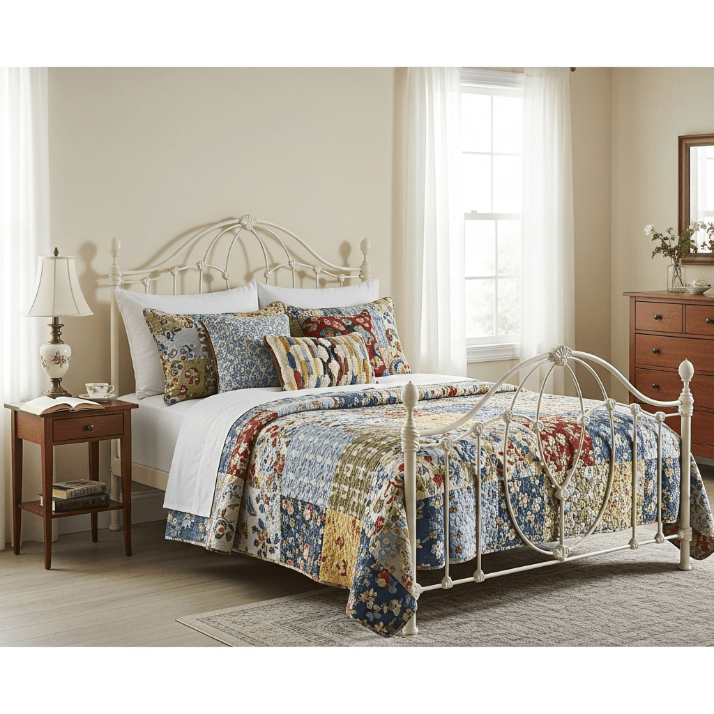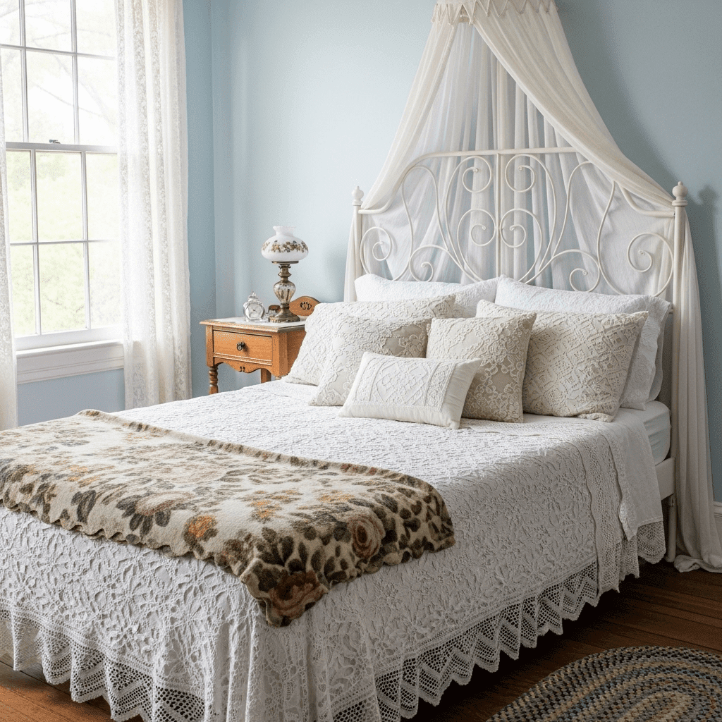 A classic black or white wrought iron bed frame is the ultimate vintage centerpiece. Its open, airy structure prevents a small room from feeling heavy, while the ornate curves add an instant sense of 19th-century romance.