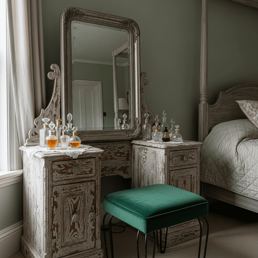 Replace a standard desk with a vintage vanity featuring a tri-fold mirror. It provides a dedicated spot for guests to get ready and adds a touch of Old Hollywood glamour to the room.