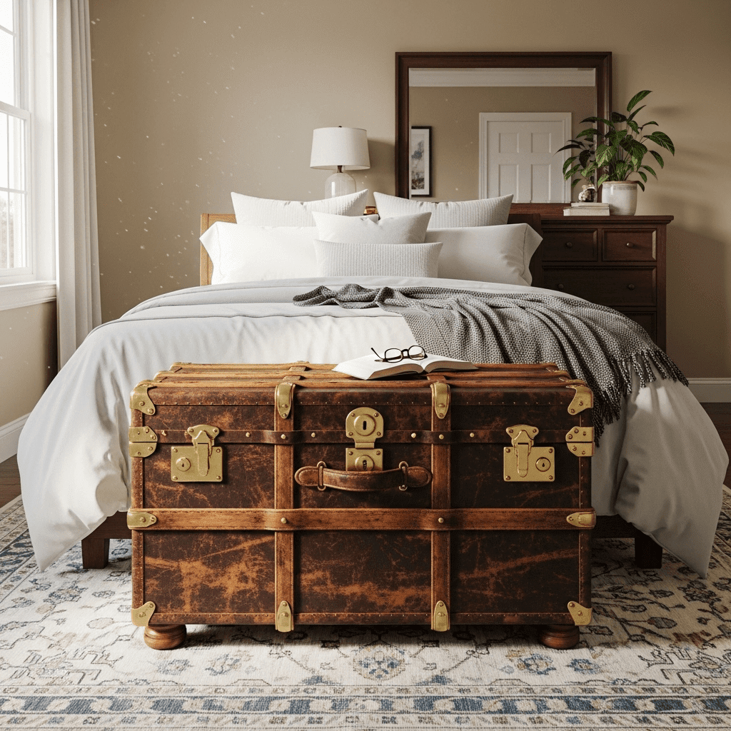 Instead of a modern luggage rack, use an antique steamer trunk at the foot of the bed. It provides a sturdy surface for suitcases and serves as extra storage for spare blankets.