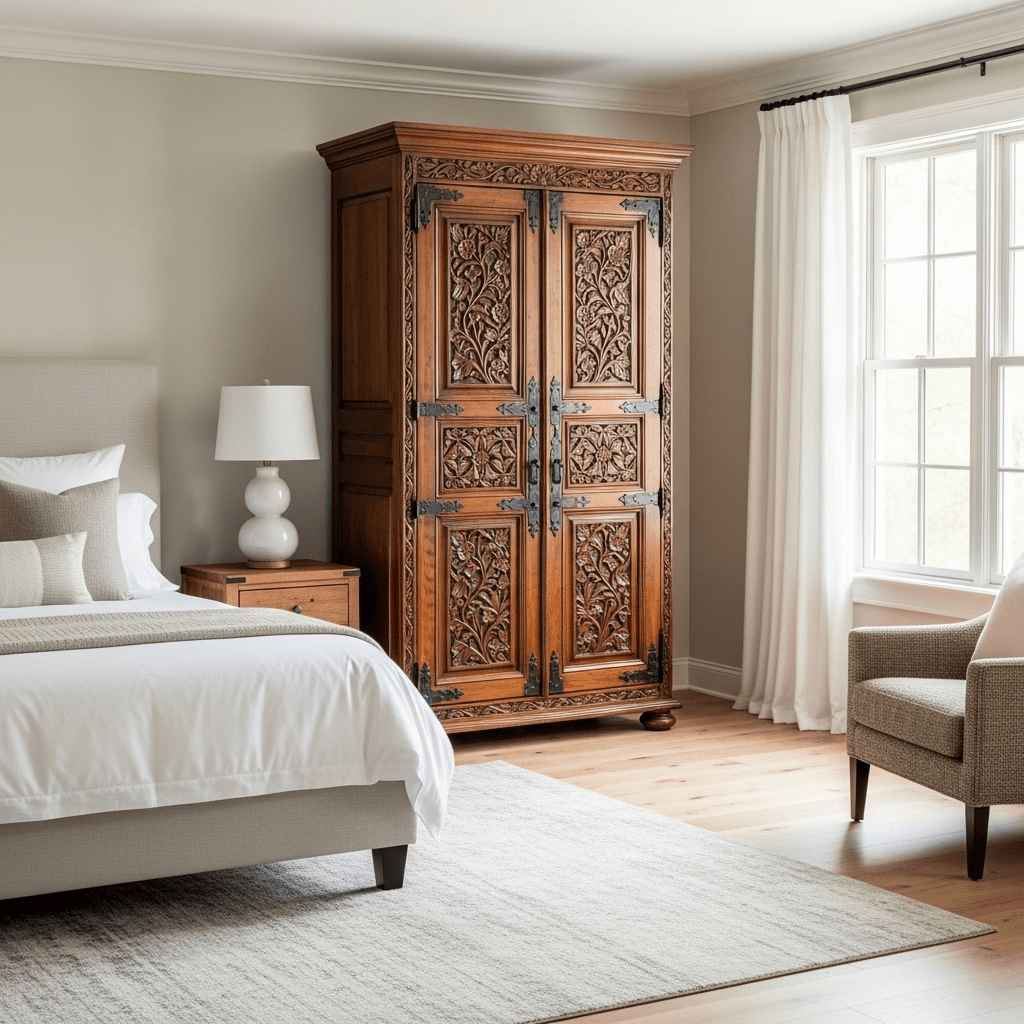 In rooms without closets, a tall antique armoire is a lifesaver. Choose a piece in walnut or cherry wood to provide a heavy, grounding element that stores everything from coats to extra pillows.